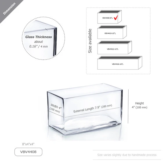 Introducing our captivating Rectangular Glass Block Vase Collection – an enchanting ensemble of finely-crafted vases, including versatile planter boxes, designed to elevate your floral arrangements, grace event centerpieces, and infuse both business and home décor with a touch of sophistication. With an extensive array of sizes and varying heights, this collection opens up a world of creative possibilities, allowing you to curate stunning displays that captivate the eye and inspire awe..